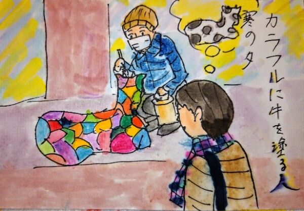 帰り道で、昨日まで白地に黒の斑点だった牛が、カラフルに塗られているのを目撃。