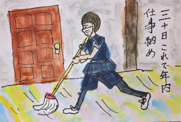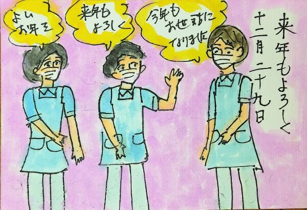 2022年12月29日 今年もお世話になりました。 12月29日(木) 晴れ朝9:00から15:00までの仕事。こちらの仕事は年内仕事納めなので、みんな口々に、「今年もお世話になりました。」「来年もよろしくお願いします。」「よいお年を」などなど言い合って、帰りました。絵には3人しか描いていませんが、今日は他に5人いました。仕事納めと書かなかったのは、もうひとつの仕事には明日も行くからです。帰り、洗濯のために、ユニフォームと、靴を持って帰りました。ユニフォームはほぼ毎回持って帰りますが、靴は1年ぶりに洗います。えっ、もっとこまめに洗えって?帰って、靴をスニーカー専用ネットに入れて、洗濯機で洗いました。NHKプラスで、「岸辺露伴は動かない」の第7話と第8話を見ました。今は、「ごちになります」の首レース結果発表生放送を見ています。 タグ :#冬