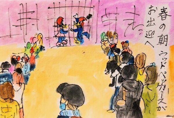 今日は8:30オープンですが、これはきっと8:00オープンだなあ、と思ったのは、オープン待ちの列の向こう、まだ閉じられた門の向こうに、ウッディー・ウッドペッカーと、ウィニー・ウッドペッカーが待機していたこと。