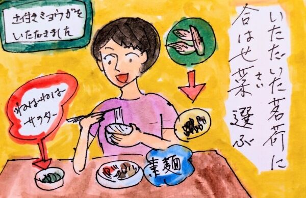 今日も、いただいた茗荷に合うネバネバ春雨サラダと、半熟卵とネギトロ丼を買って帰りました。