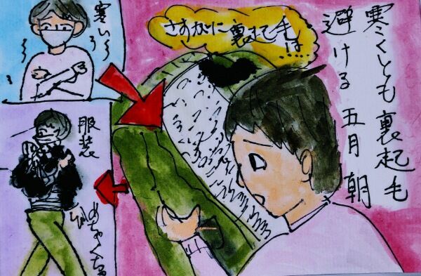 朝の寒さは、肌寒いというレベルではなく、冬のコートを着たいぐらいでしたが、裏起毛のジャケットすら帰りのことを考えると、5月なのに嫌だ、と思い、ヘンテコリンな重ね着をして出掛けました。