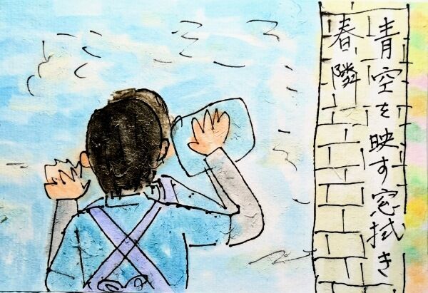 絵手紙は、午後の別棟の掃除の最後に玄関周りの窓ガラスを拭くのですが、実際には絵に描いたような雲が浮かぶ空ではなく、雲のない真っ青な空でした。でも、その真っ青な空を映す窓ガラスを描くのって、至難の業!