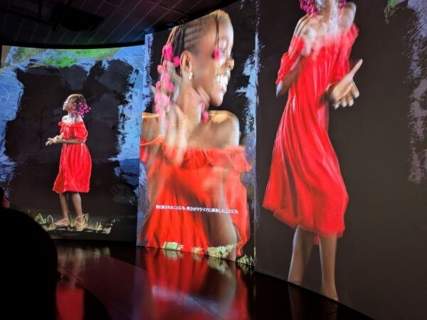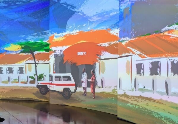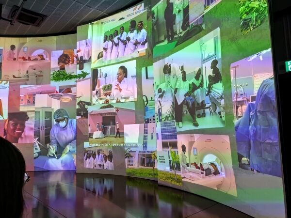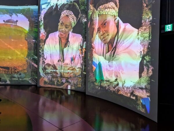民族太鼓のビートに導かれて館内に足を踏み入れると、伝統工芸品や民族衣装にエキゾチシズムを誘われ、歌と踊りのステージでお祭り気分に。シアターでは幼少期にマラリアから救われ、医療従事者となった女性のドキュメンタリーを上映。アンゴラが直面する感染症対策、子どもの栄養改善、遠隔医療支援などの課題、それに立ち向かう人々の姿を美しい展示で紹介しており、身体全体で“生きるエネルギー”を感じられるだろう。