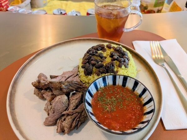 ご飯の上には黄色いものと干しブドウが乗っていて、干しブドウのおかげで甘い。黄色いものは食感的にはバスマティ(パサパサした細長い米)だと思われるので、サフランで色をつけてあるのだと思います。