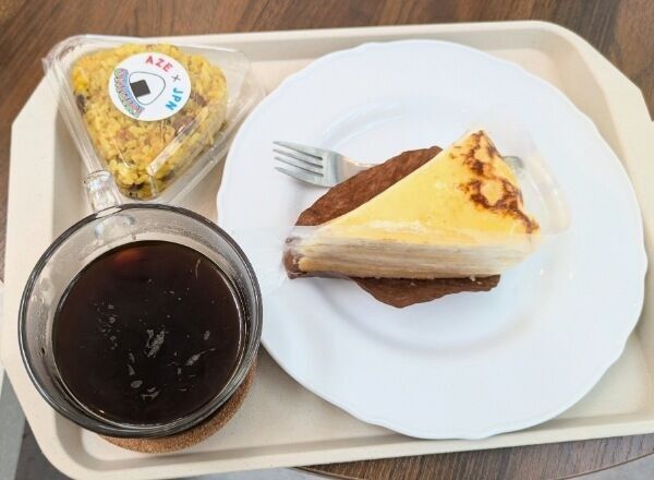 アゼルバイジャンの料理と日本のおむすびが融合したおむすびと、バニラクリームチーズケーキとコーヒーでランチ。