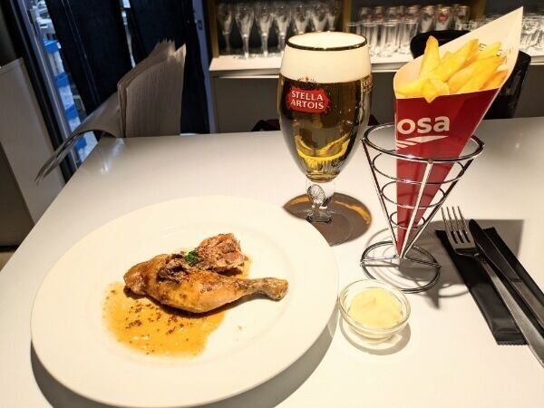 骨付き鶏肉のコンフィー(フライドポテト付き)と生ビールステラアルトウ大