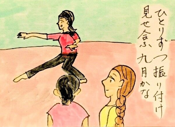 振り付けはまず曲で一回踊り、問題点と改善策を指摘していただいた後、前半だけ一人ずつ踊り、お互い感想を言い合いました。